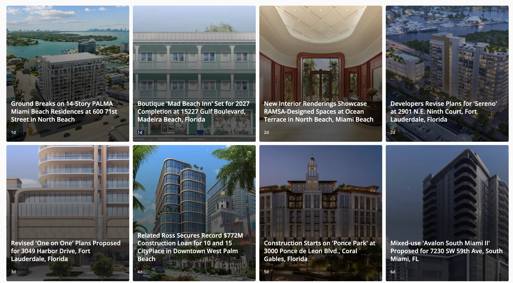 Easily find residential and mixed-use projects across South Florida. Identify new developments, track construction activity, and understand what’s shaping each neighborhood. and construction, with comprehensive project data, market news, and statistics—all in one centralized platform.